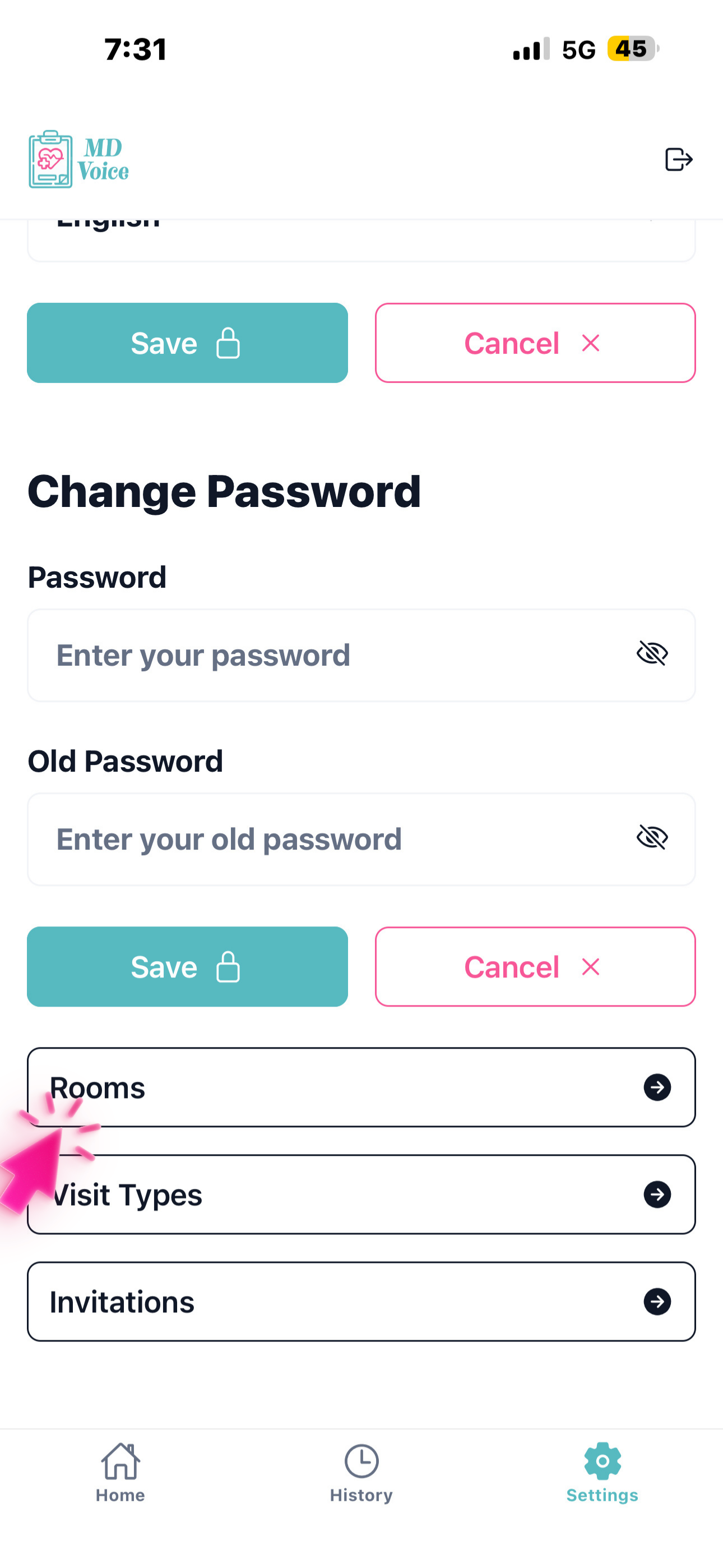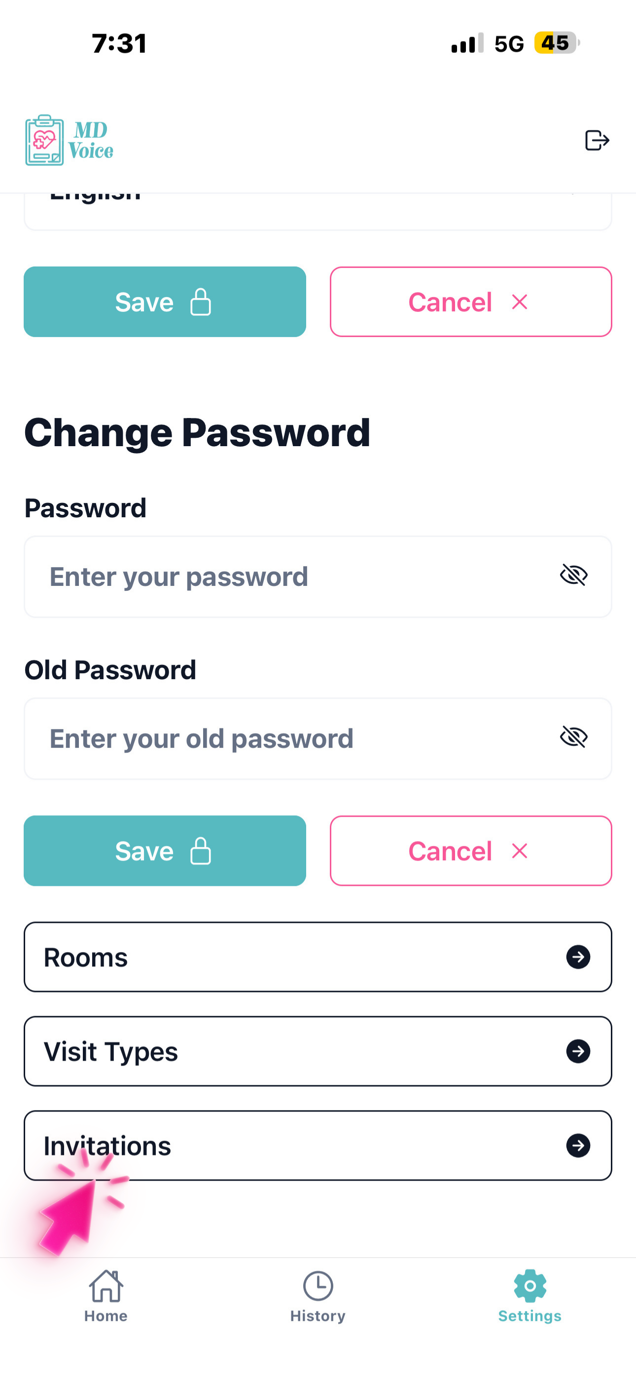 Check your inbox (and spam folder) for the verification code. Once logged in, the home screen will prompt you to accept a clinic invitation before you can access any patient data or recording features.
