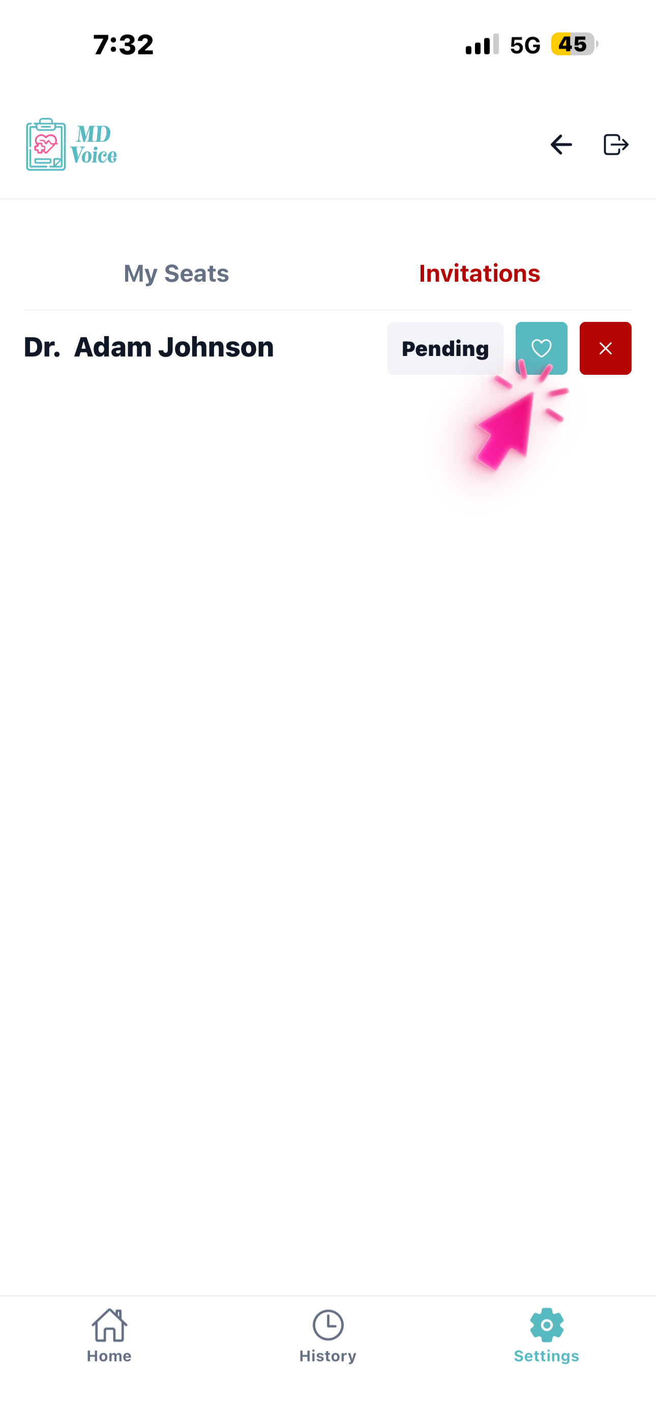 After accepting the invitation, go back to the home page. Your clinic will now appear in the dropdown menu. If you don't see a pending invitation, ask your Doctor, NP, or PA to resend it from their Settings → Seats page.