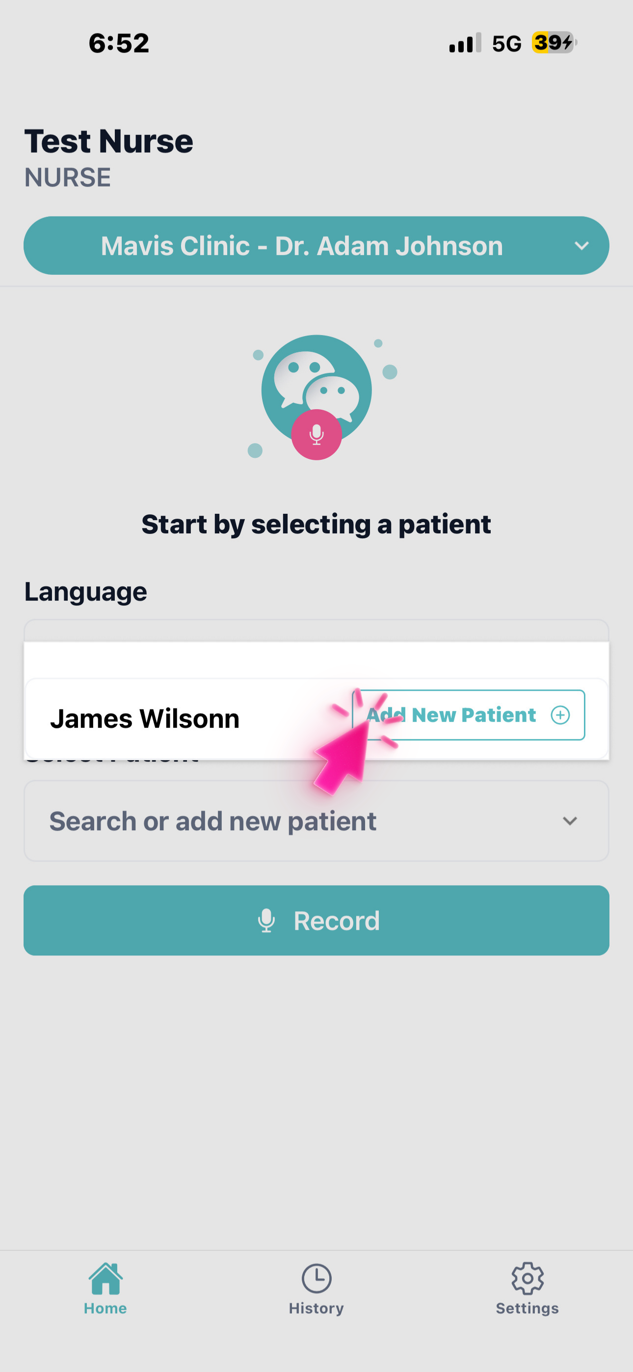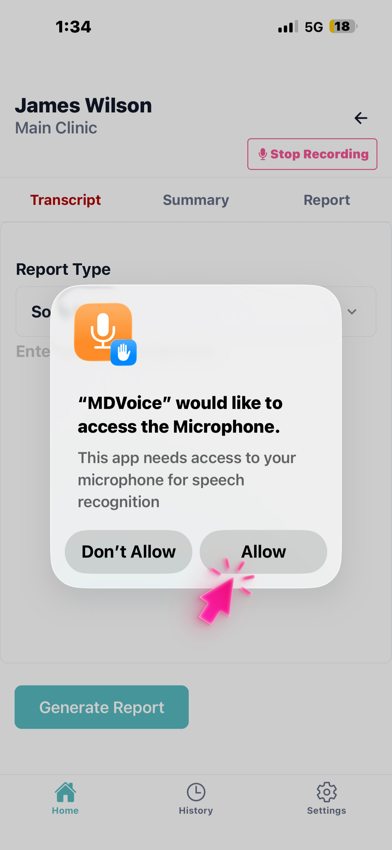 On first use, the app will ask permission to access your microphone and speech recognition. Tap 'Allow' for both prompts. The conversation will be transcribed in real time as you speak with the patient.