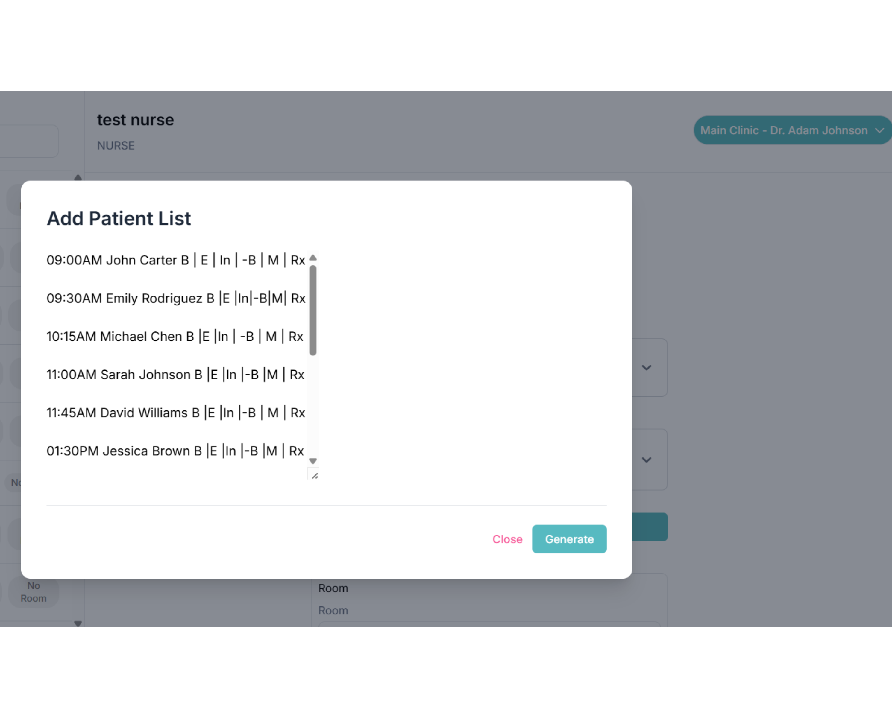 On the web version, click 'Add Patient List' to paste your doctor's schedule directly from the EMR and click 'Generate' to populate the list. On mobile, you can search for existing patients or tap 'Add New Patient' to create entries individually.