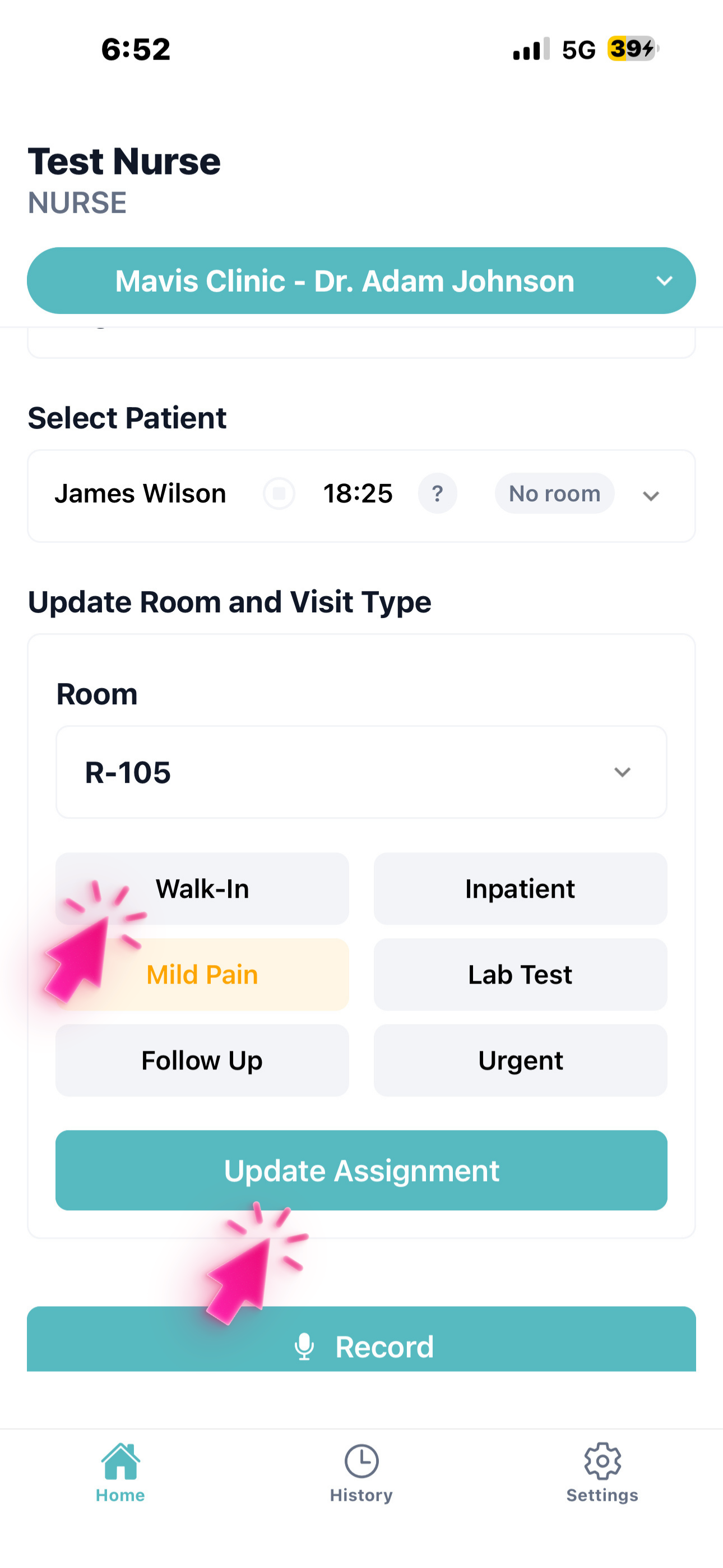 Select a patient, assign the room and visit type, then tap 'Update Assignment.' Room names and visit types can be edited in Settings.