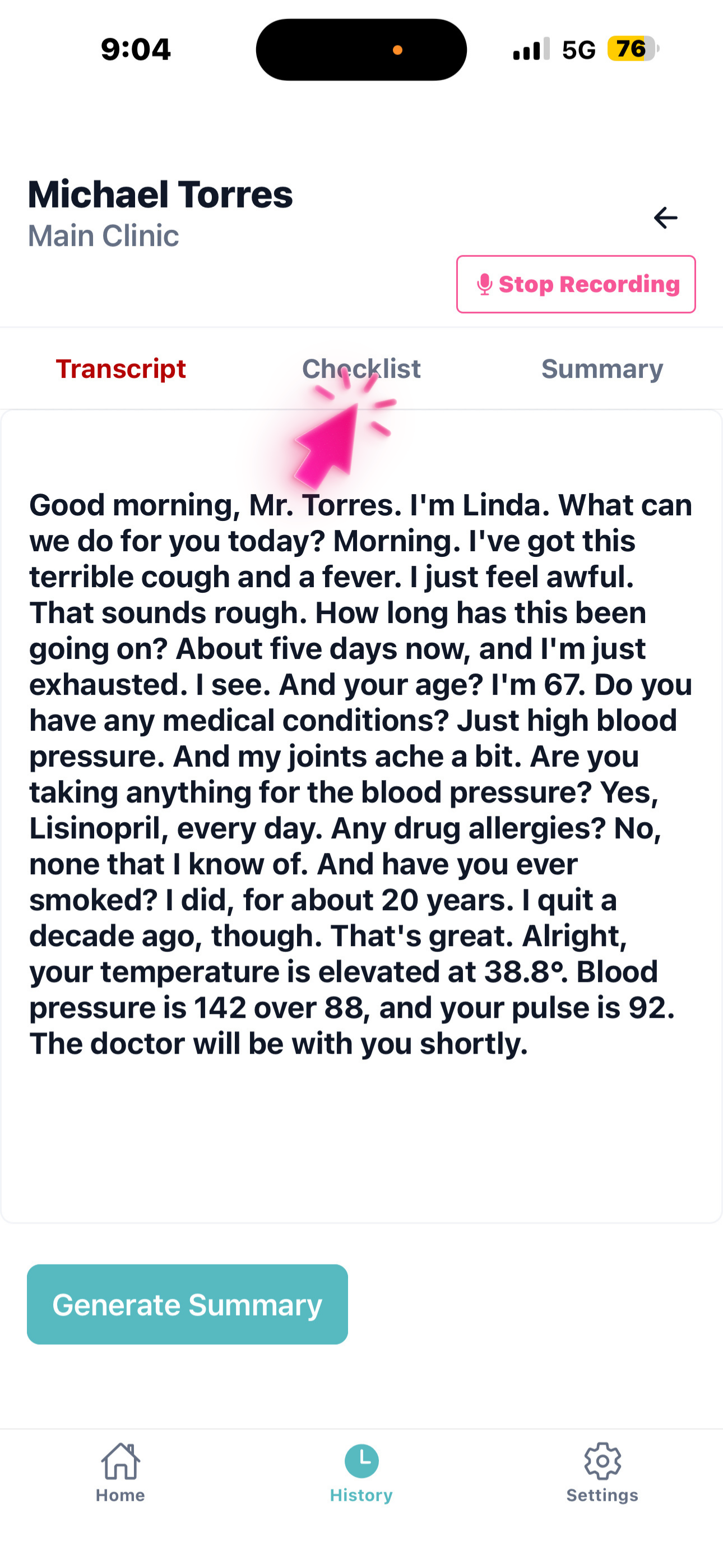 When done, tap 'Generate Summary' to create the patient summary. Review it, and it will be automatically sent to the doctor in real time.