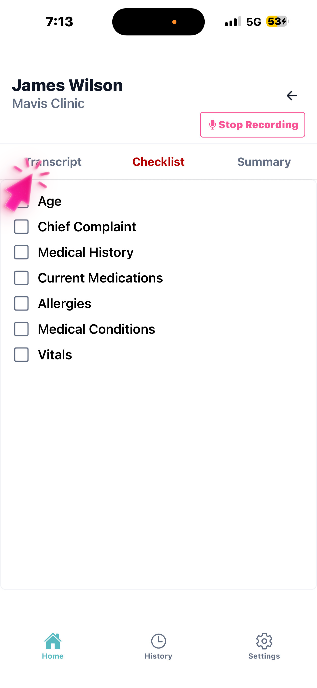 While recording, tap 'Checklist' to view the questions or information requested by the doctor. You can ask them as-is or rephrase them.
