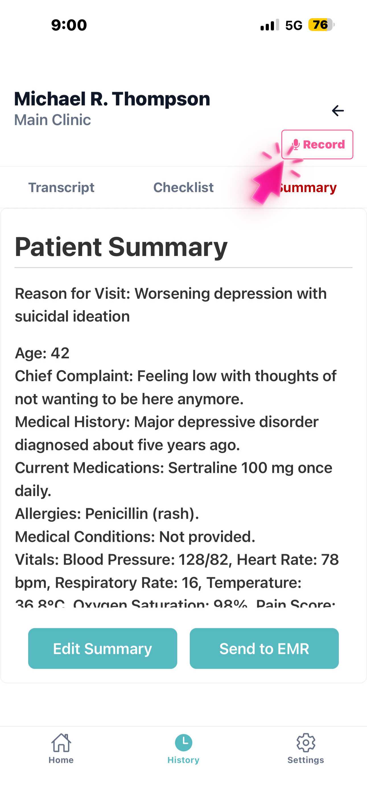 The generated summary organizes all captured information into a structured format. You can review and edit it before or after sending. Any updates you make will be reflected instantly on the doctor's side. You can also tap 'Send to EMR' if the integration is set up.